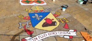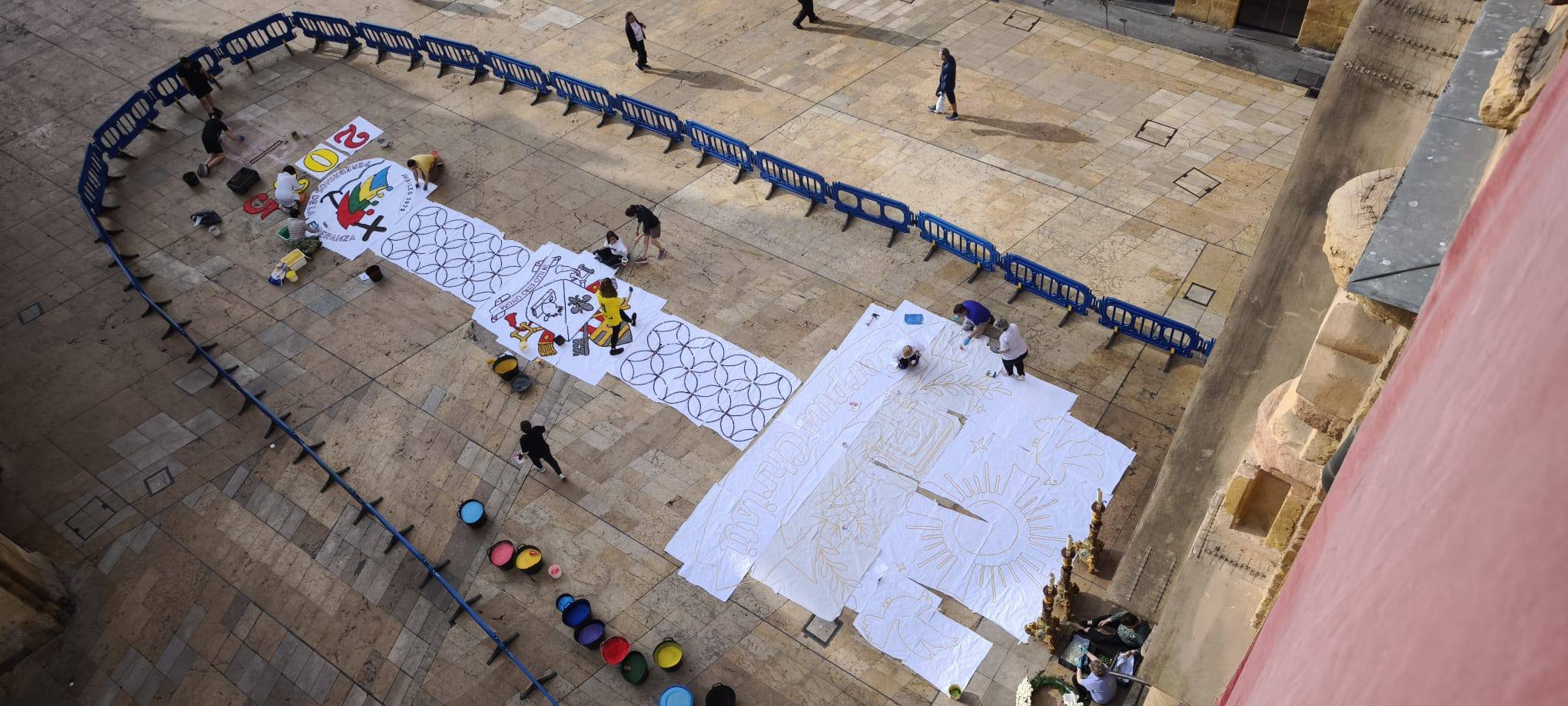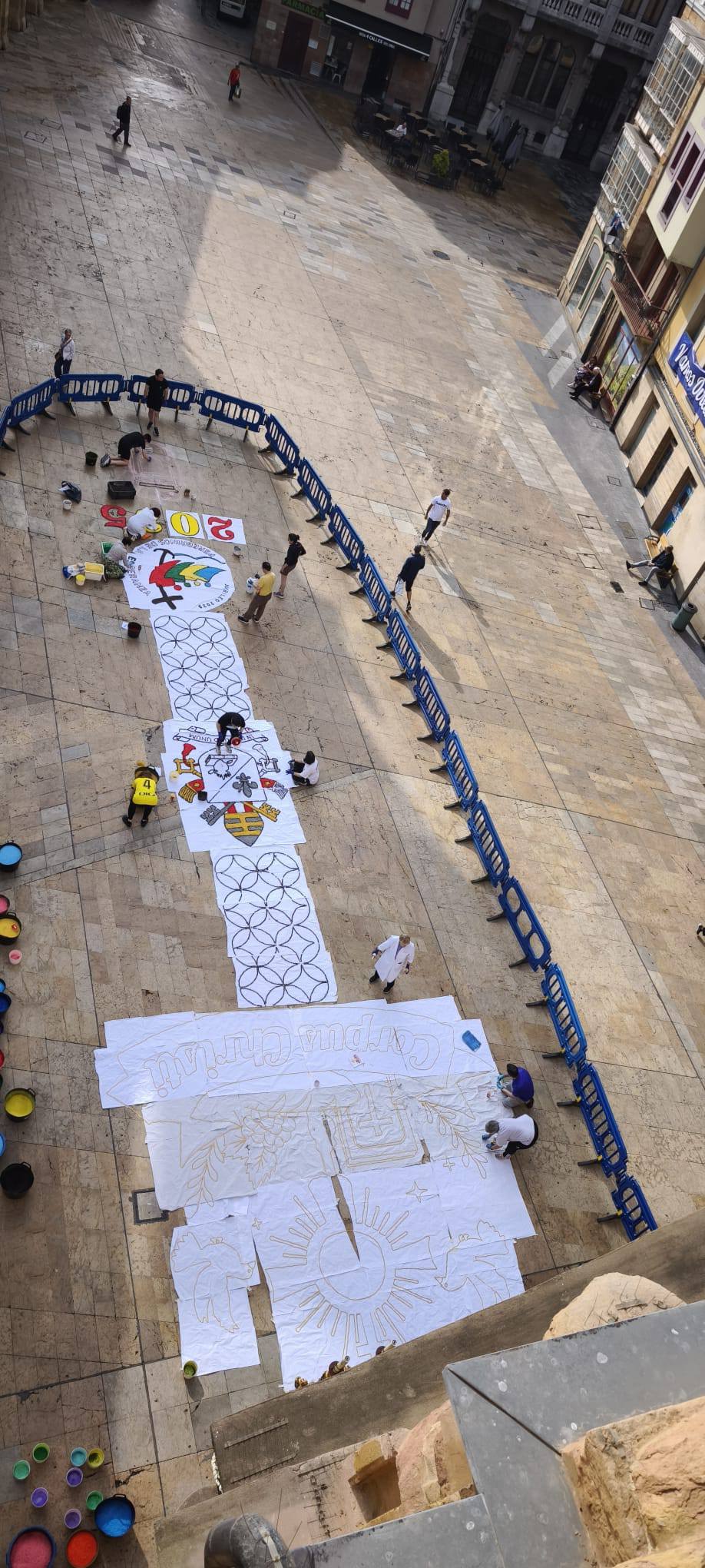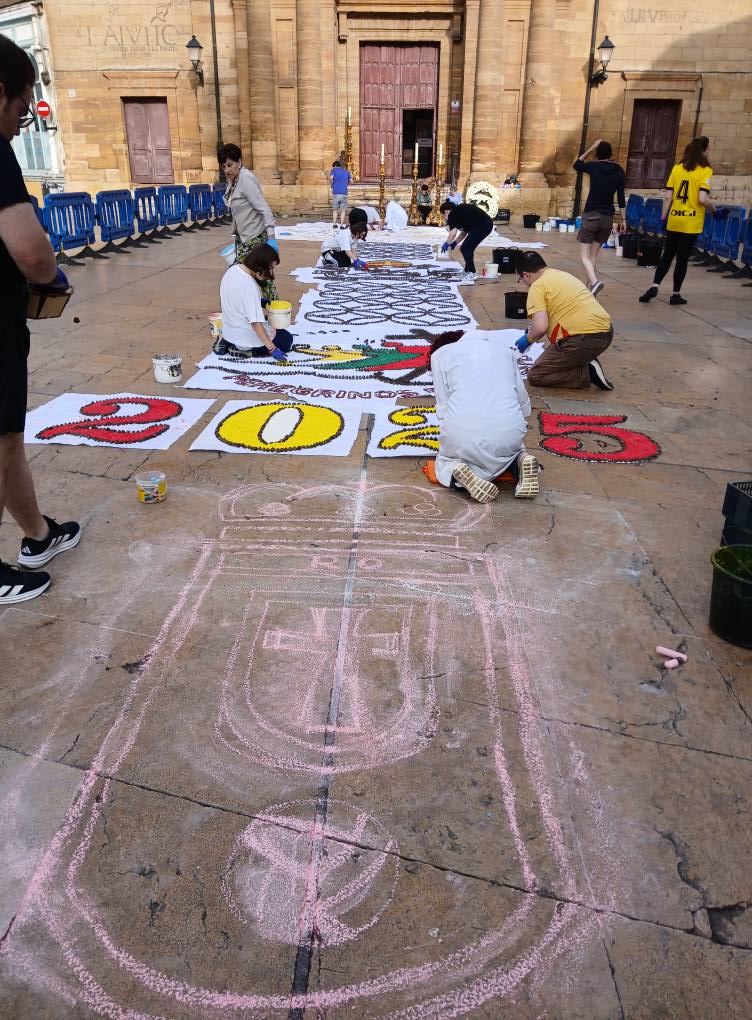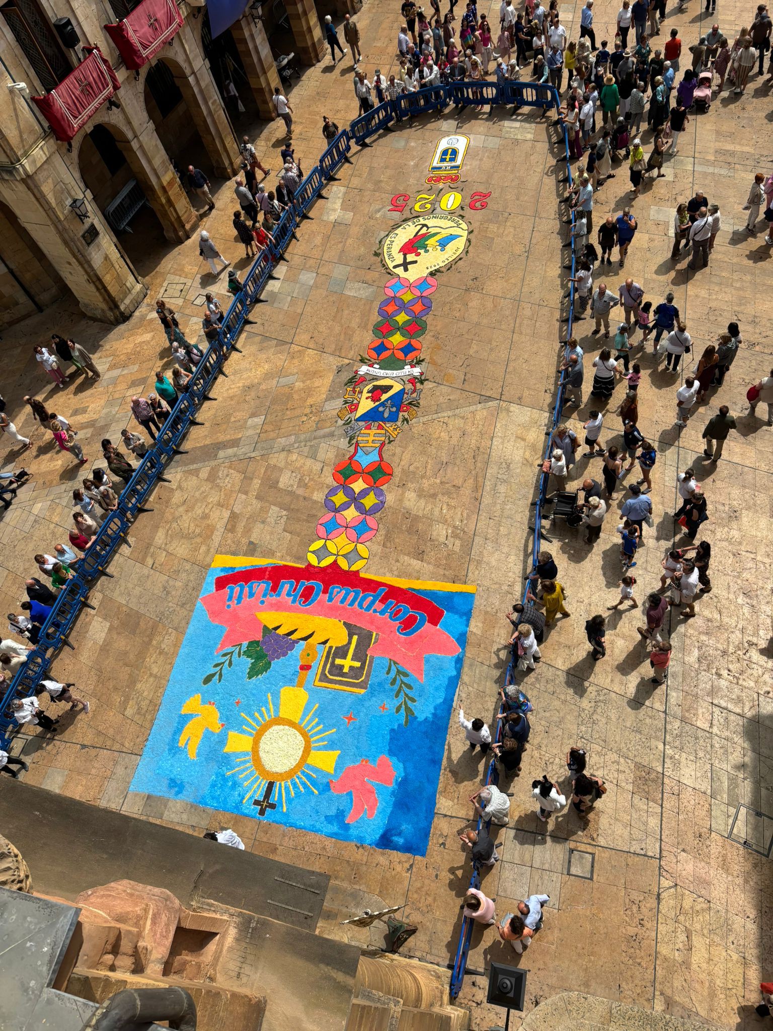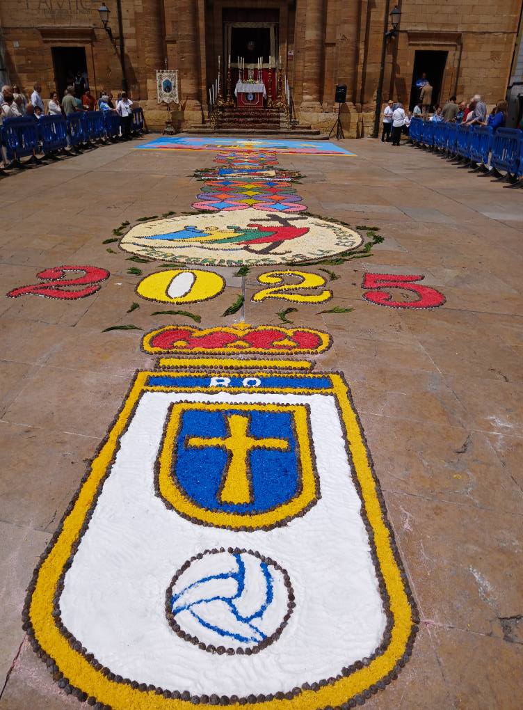 Bien de mañana, y después de la oración, se comenzaron los trabajos de colocación de la alfombra. Este año el motivo central ha sido la custodia acompañada de les especies eucarísticas. Mientras que las pasilleras llevaban motivos geométricos, el escudo de Su Santidad León XIV, el anagrama del Año Jubilar y un escudo del Real Oviedo. Este último con el mérito añadido de ser pintado a mano alzada directamente en la plaza.