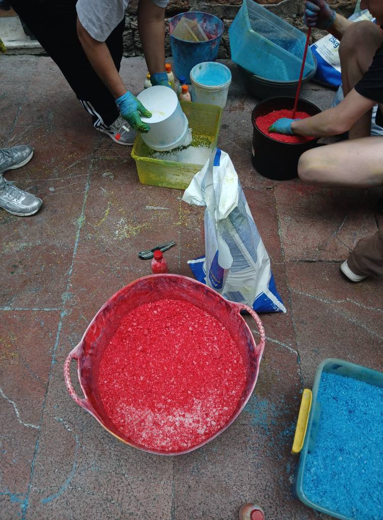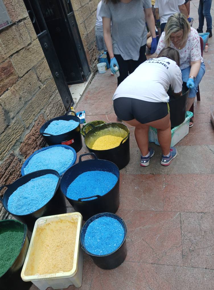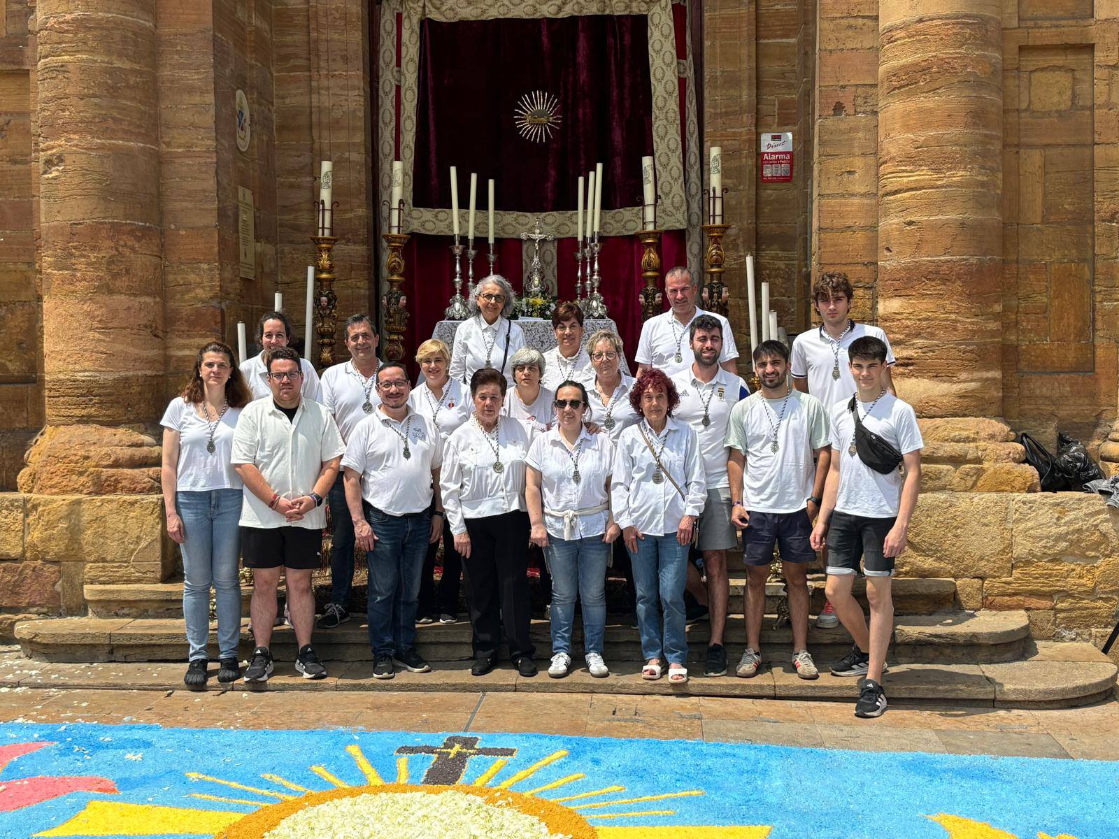 Allí, cumpliendo con la tradición, nuestra Archicofradía volvió a colocar la alfombra en honor del Señor. Jornada que culmina el trabajo realizado a lo largo de estas últimas semanas. Diseño, pintado, preparación de la sal,… todo ello en un clima de fraternidad y buen ambiente. Este año se concluyeron los trabajos previos con un día adelanto debido al trascendental partido del Real Oviedo en la final del ascenso a primera división. Por otra parte brillantemente lograda.