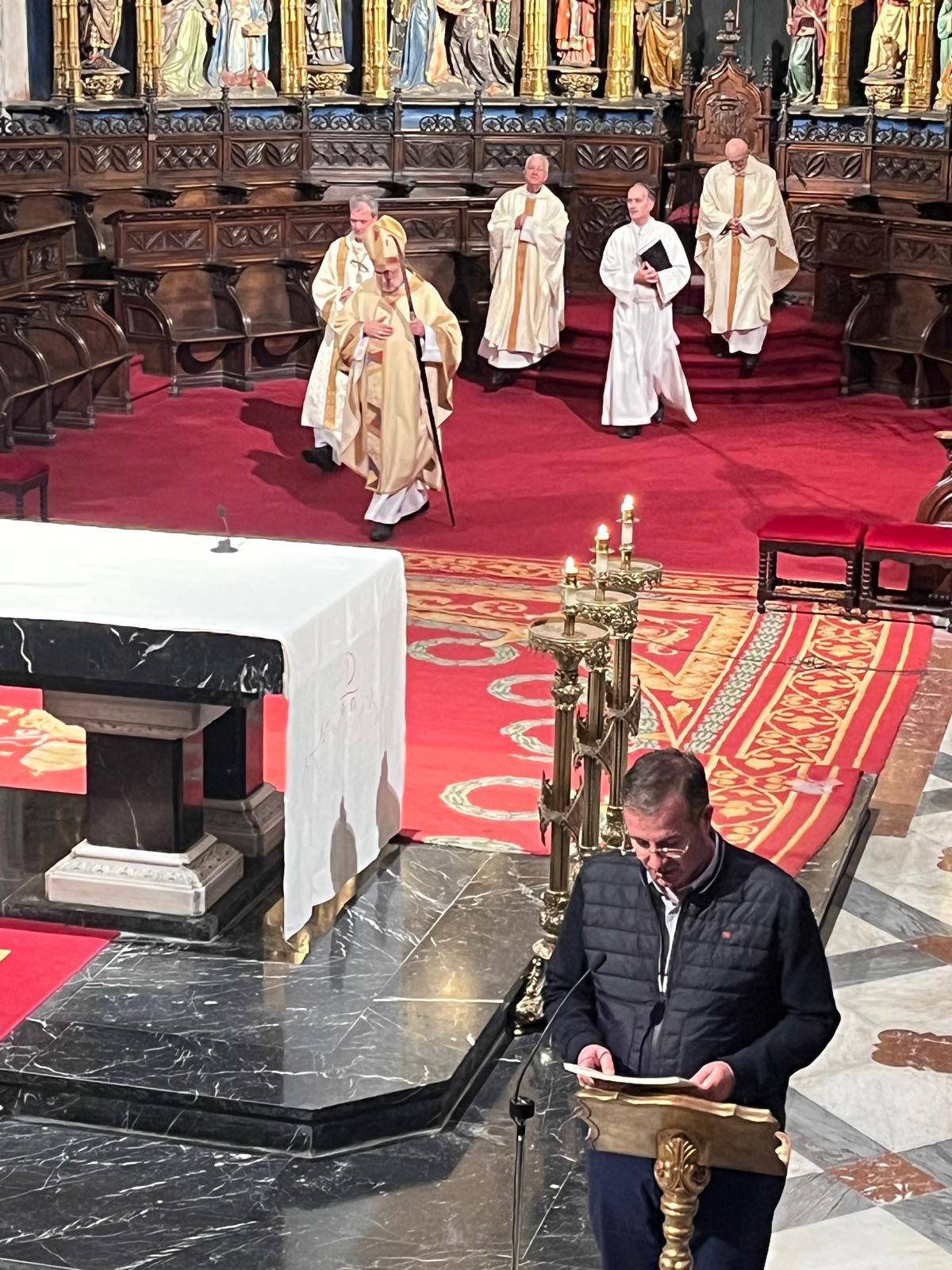 Iniciamos el encuentro, con el rezo del Santo Rosario, en nuestra sede canónica de San Isidoro el Real, debido que a la constante lluvia impidió la procesión con la imagen de Nuestra Señora de la Esperanza, La Balesquida. Durante el mismo la Banda de la Unión Musical del Principado interpretó varias marchas. Una vez concluido nos trasladamos a la Santa Iglesia Catedral, con una parada en la Capilla de La Balesquida para cantar la Salve, donde participamos de la Santa Misa presidida por el Sr. Arzobispo.